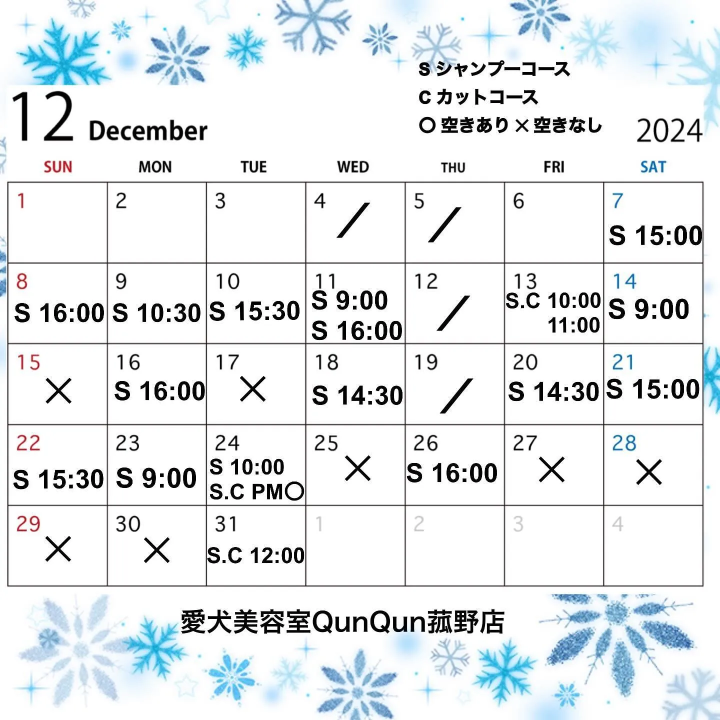 愛犬美容室クンクン菰野店 2024/12/06 愛犬美容室クンクン菰野店 12月の空き状況です⛄️ オプションのみご利用の方はカレンダーに空きがない日でも受付出来る可能性があります✨ 空いている日付でも犬種によっては時間が足りない為 お受け出来ない場合もございます。ご了承ください。 ご予約お待ちしております😊