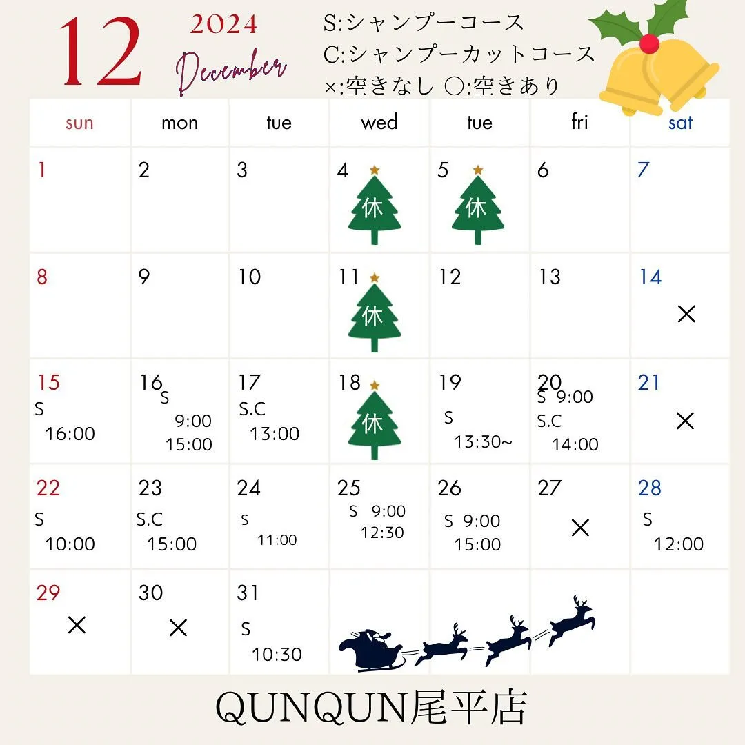 🎄愛犬美容室 QunQun 尾平店 2024/12/13 🎄愛犬美容室 QunQun 尾平店 12月空き状況です🎅 オプションのみご利用のお客様は、カレンダーに空きがない日でも受付できる可能性もあります🎶 🙏空いている日でも犬種によっては時間が足りない場合もあるため、お受けできないこともございます🙇♀️ ご予約お待ちしております🤗