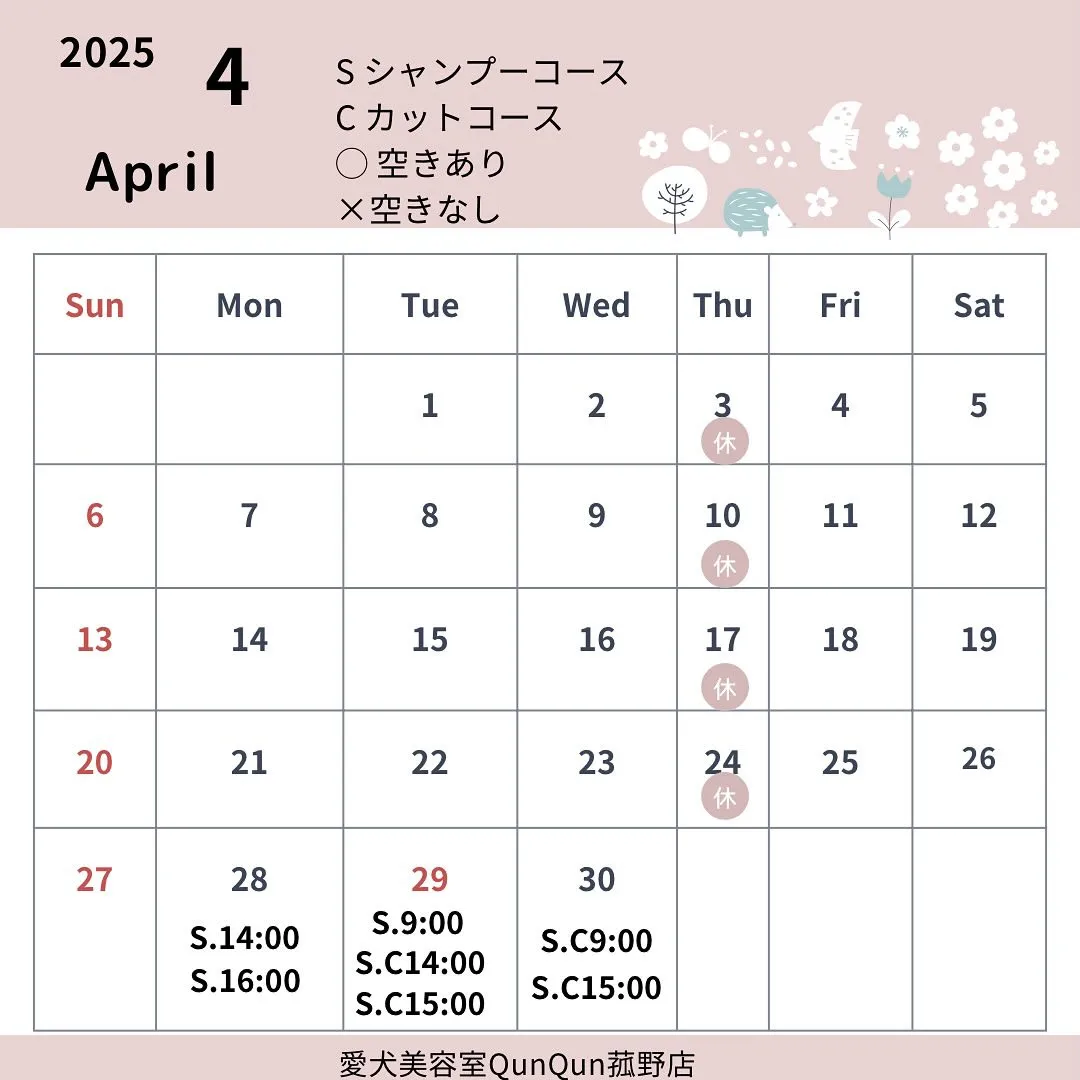 4月の空き状況です(4月28日時点)