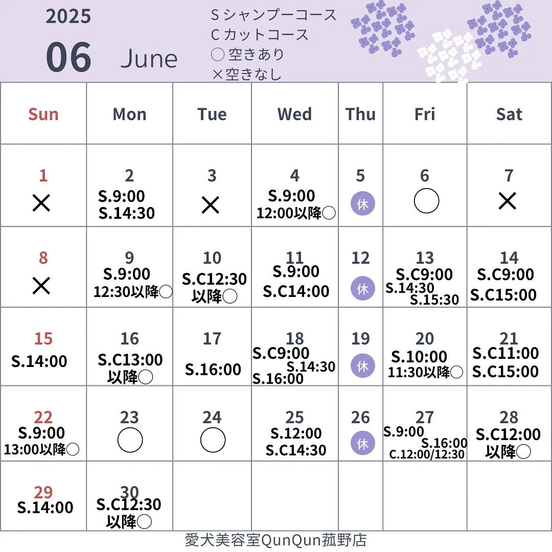 愛犬美容室 QunQun 菰野店6月空き状況(5/30時点)です☔️