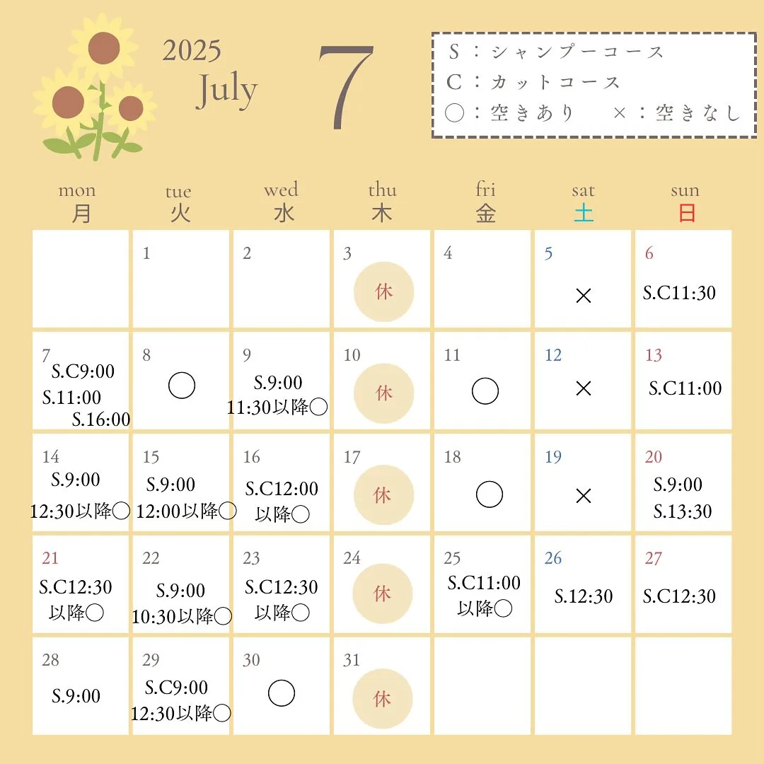 愛犬美容室QunQun菰野店 2025/07/05 愛犬美容室QunQun菰野店 7月の空き状況です☀️(7月5日9:45) オプションのみご利用の方はカレンダーに空きがない日でも受付出来る可能性があります✨ 空いている日付でも犬種によっては時間が足りないため お受けできない場合もございます。ご利用ください。 愛犬美容室クンクン菰野店 059-391-2320