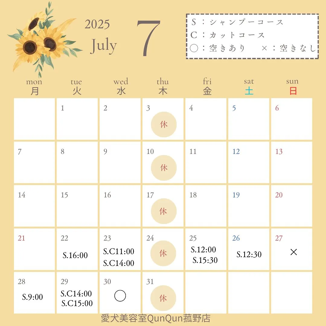7月の空き状況です☀️(7月22日15:30時点)