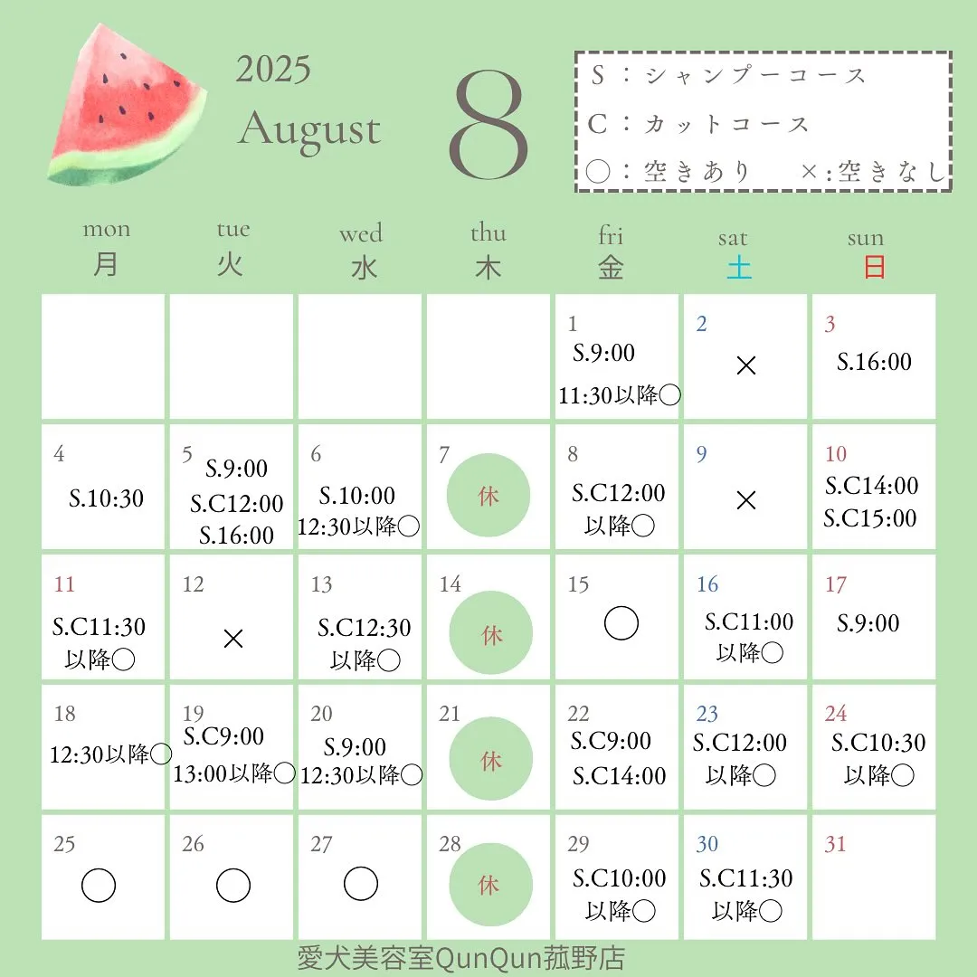 愛犬美容室 QunQun 菰野店 8月空き状況(7/25時点)です