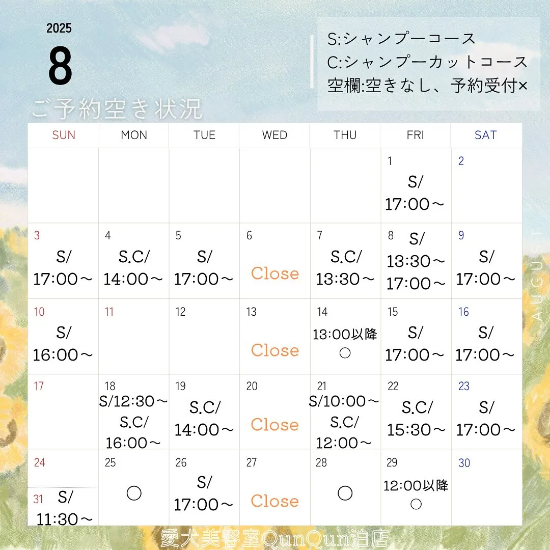 8月空き状況です🤍🐾(7月28日18:30時点)