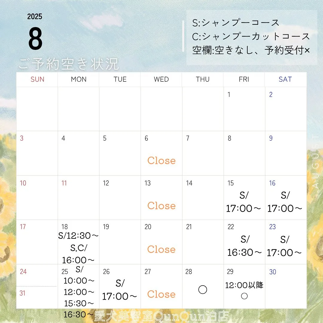 8月空き状況です🤍🐾(8月9日15:00時点)