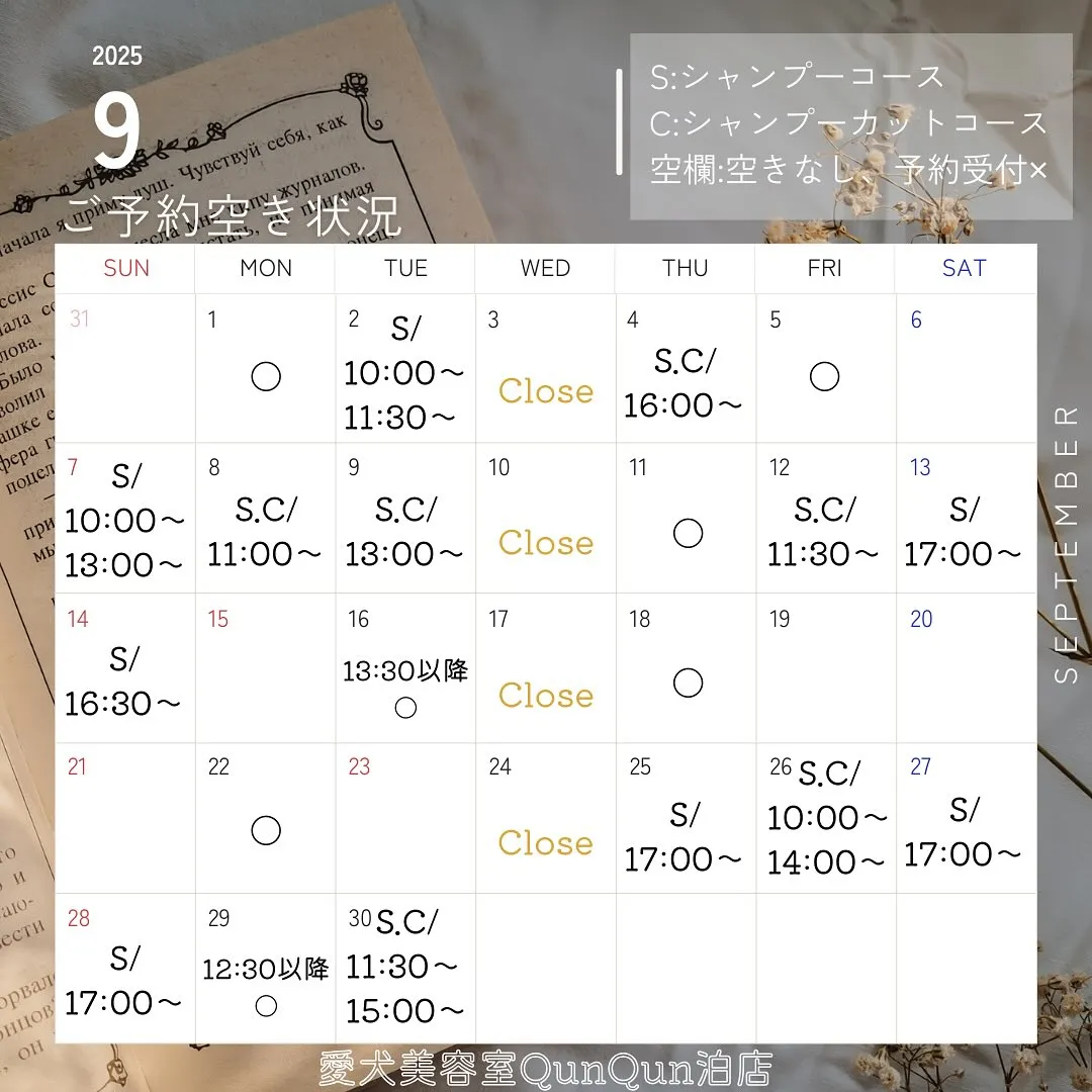 9月空き状況です🤍🐾(8月25日16:30時点)