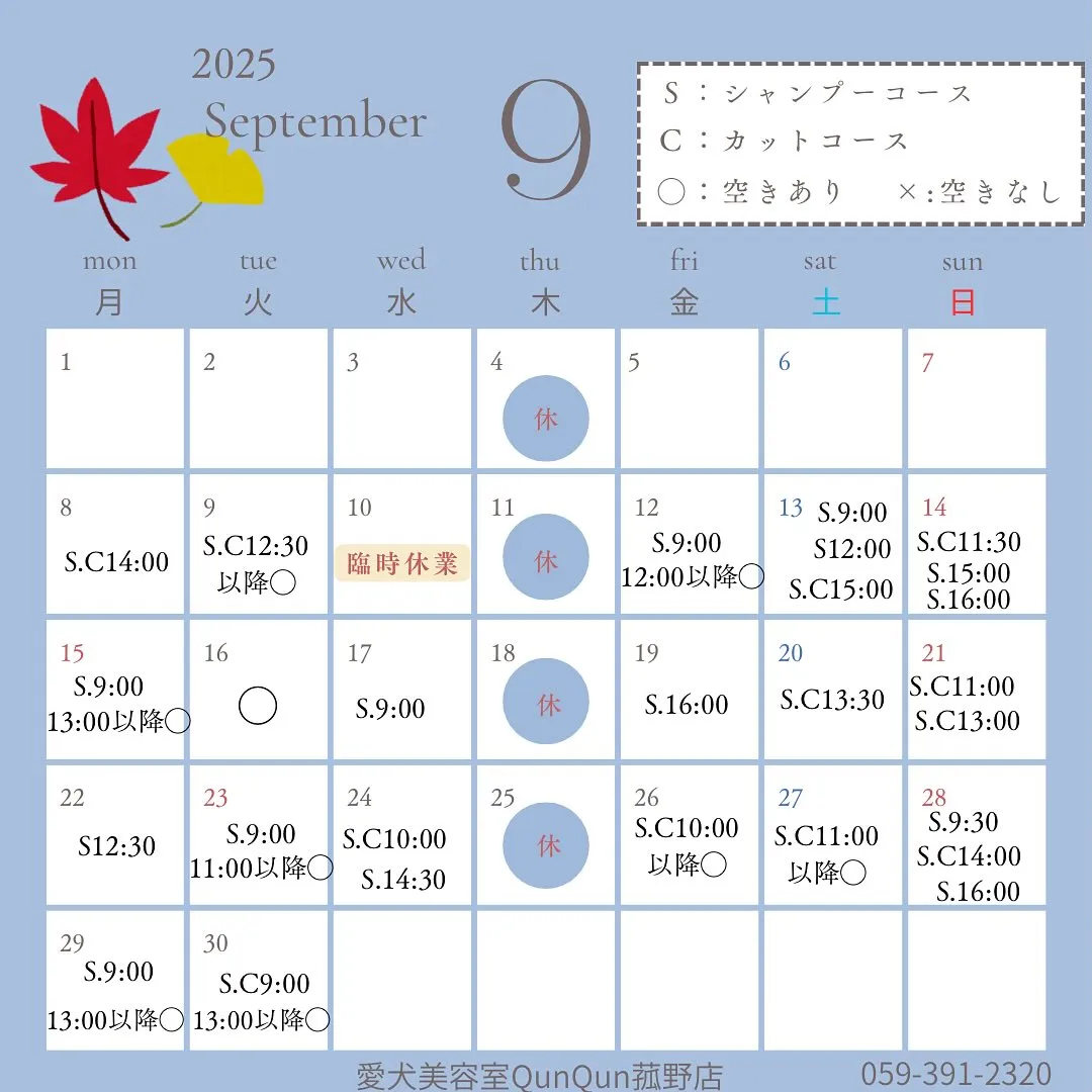 9月の空き状況です🍁(9/7 15:20時点)