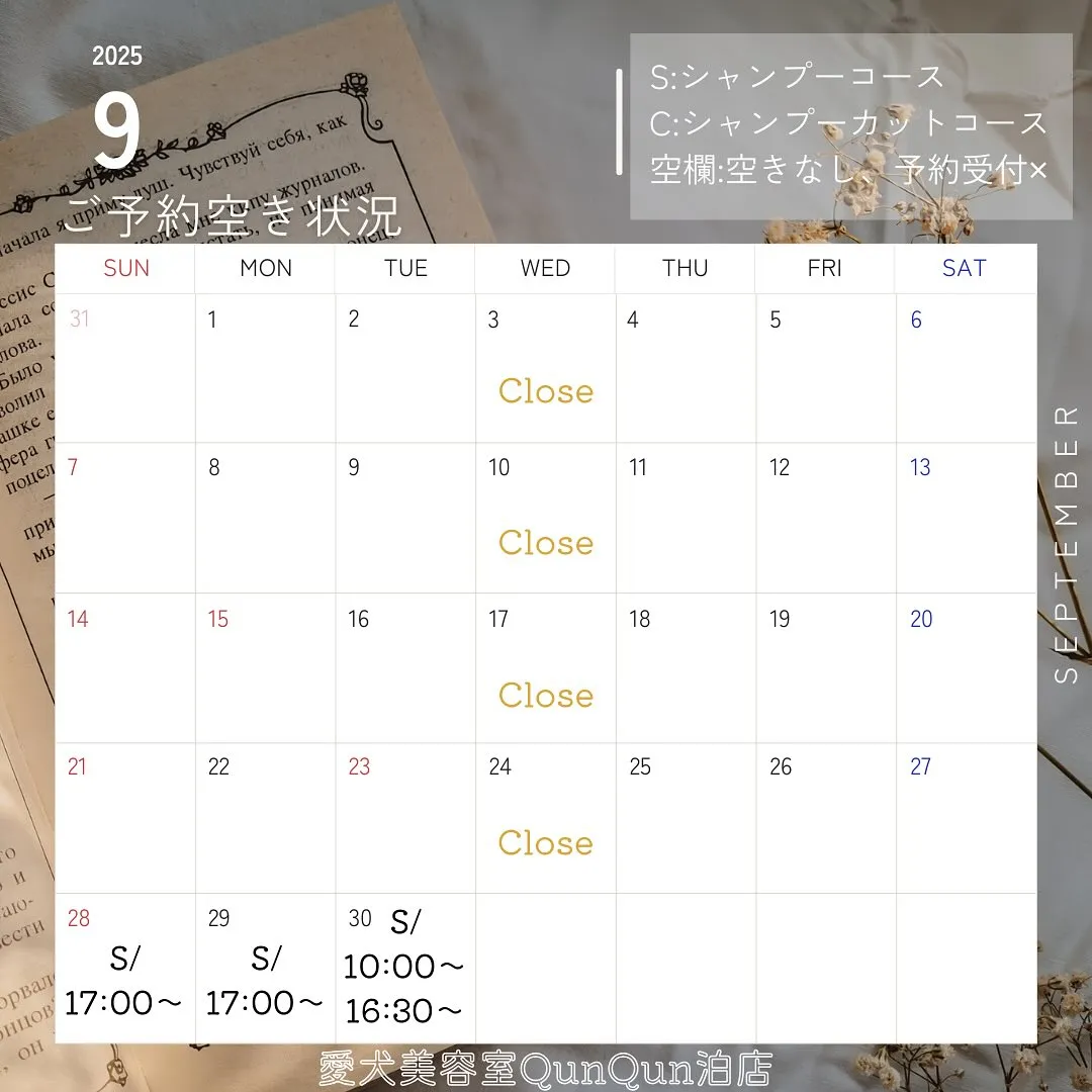 9月空き状況です🤍🐾(9月20日14:15時点)