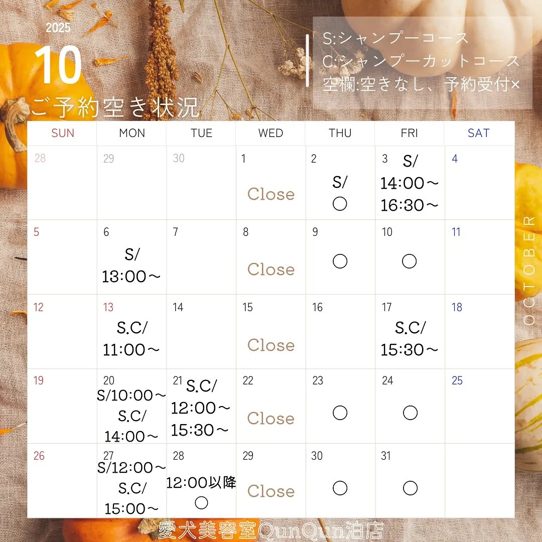 10月空き状況です🤍🐾(9月28日16:00時点)