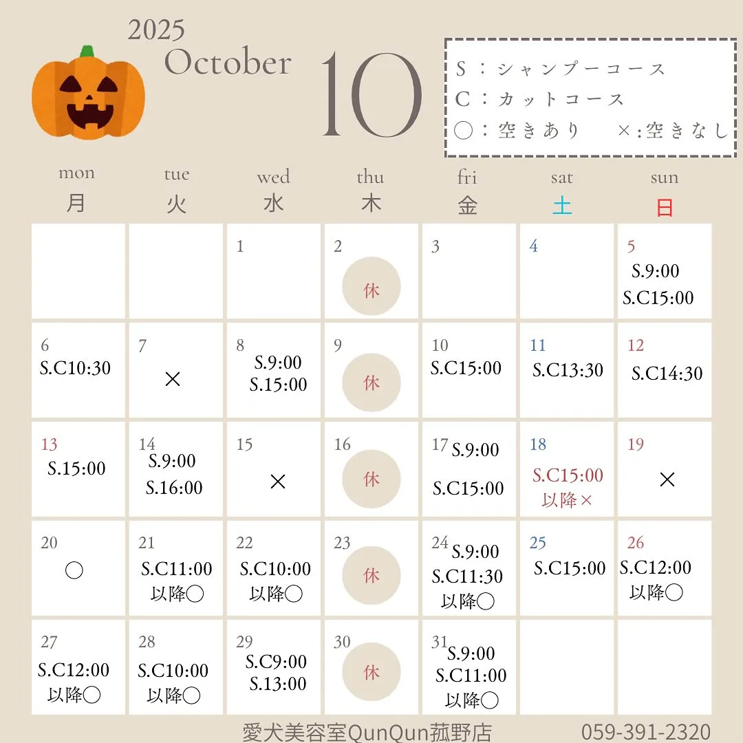 愛犬美容室クンクン菰野店 2025/10/03 愛犬美容室クンクン菰野店 10月の空き状況です🎃 オプションのみご利用の方はカレンダーに空きがない日付でも受付出来る可能性があります。 空いている日付でも犬種によっては時間が足りない為お受け出来ない場合もございます。ご了承ください。 ご予約お待ちしております😊 愛犬美容室クンクン菰野店 059-391-2320