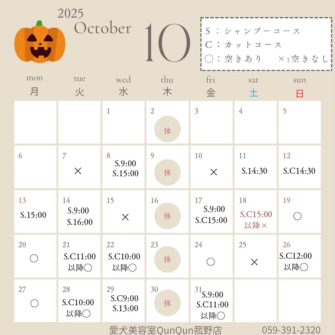 10月の空き状況です🎃(10/7 17:50)