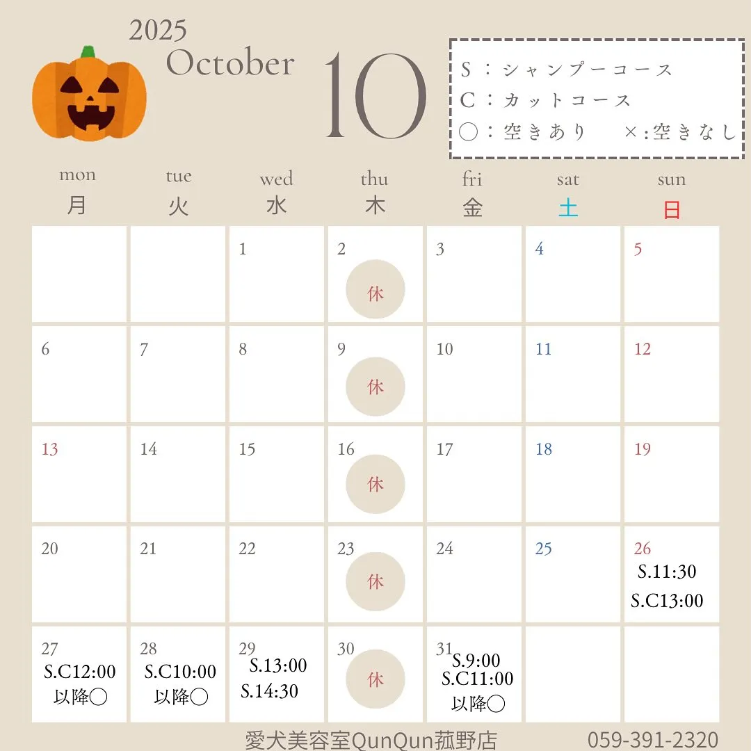 10月の空き状況です🎃(10/26 9:15)