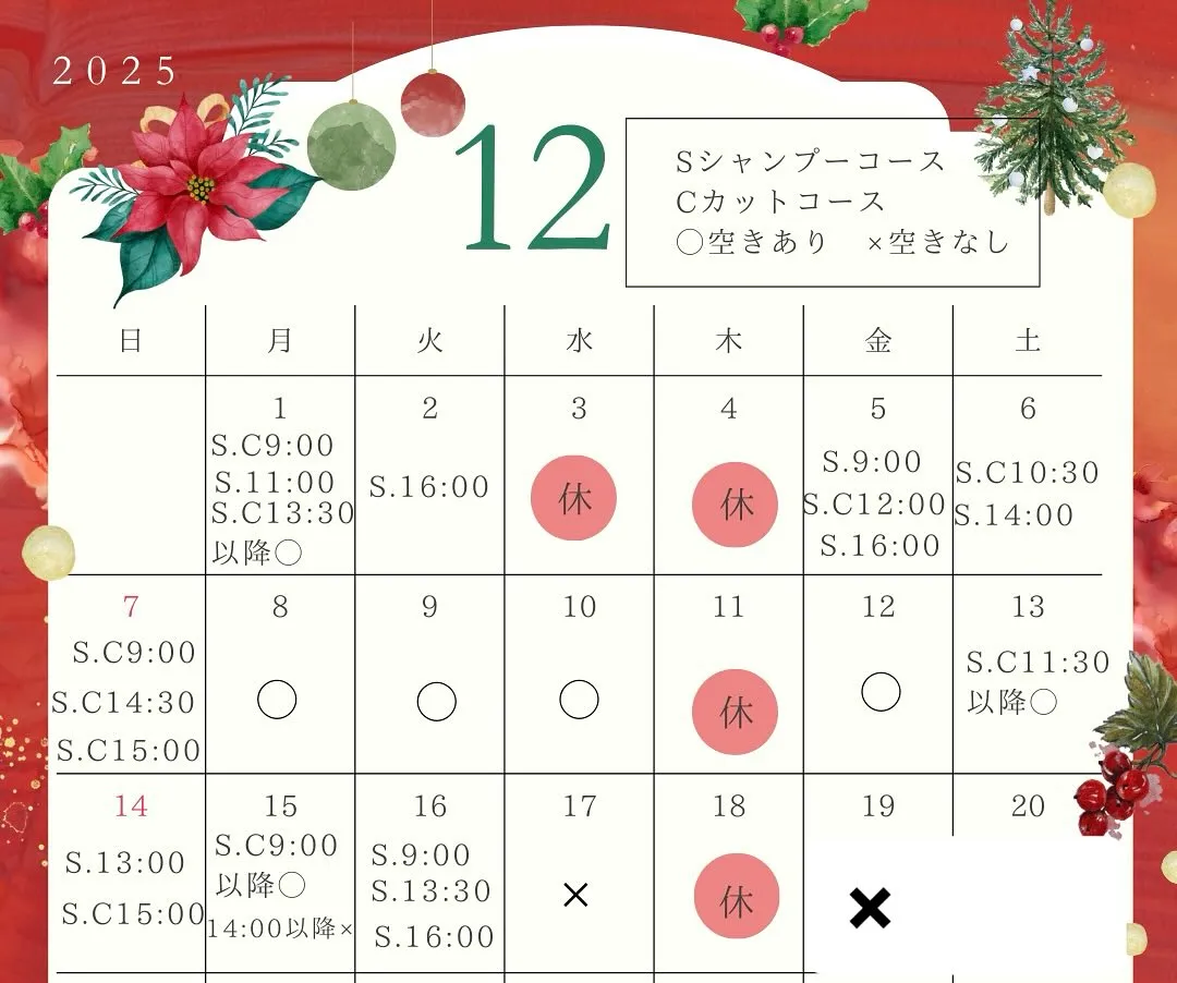 12月上旬空き状況(11/29時点)です🎄