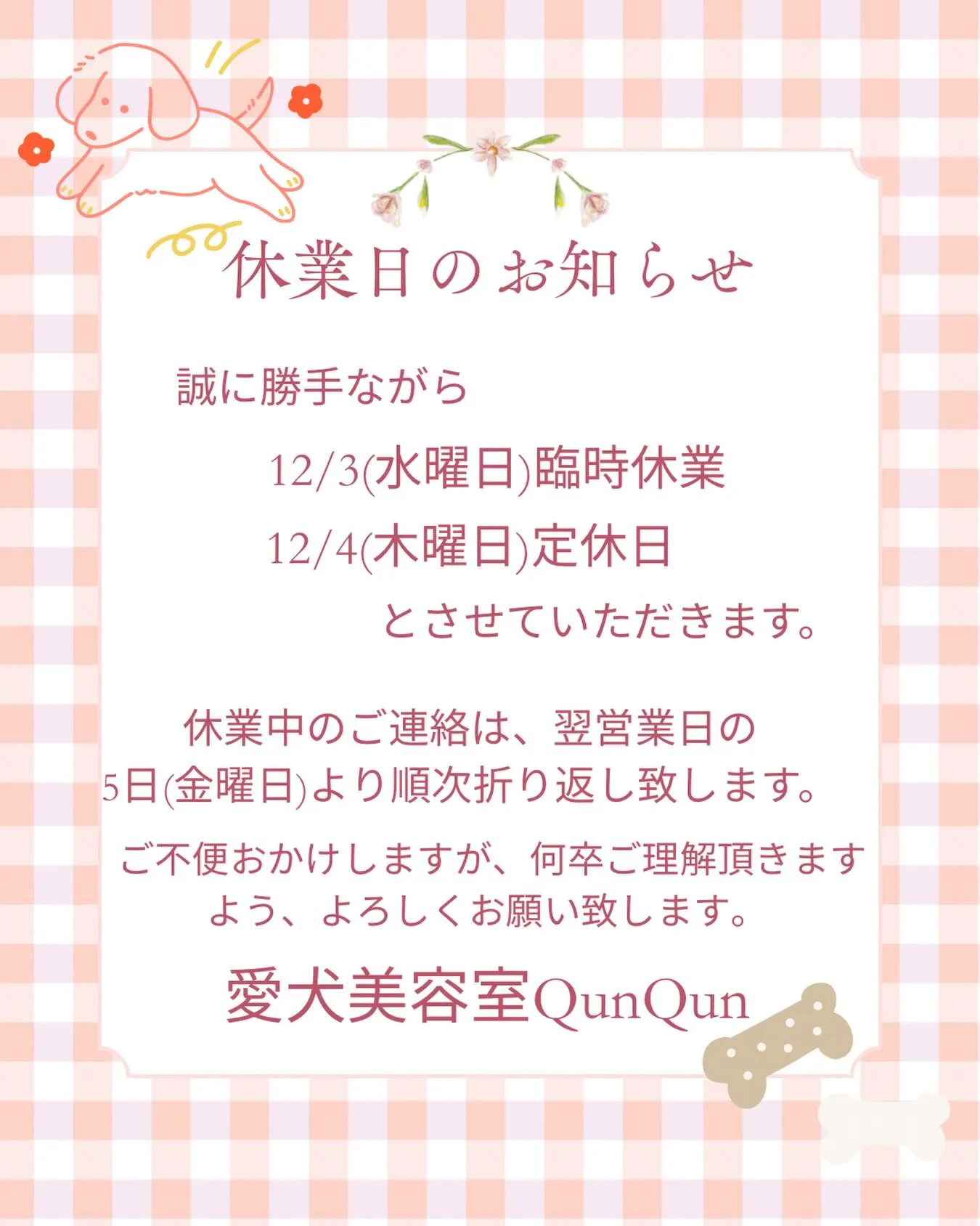 愛犬美容室QunQunよりお知らせ⋆͛📢⋆ 2025/12/02 愛犬美容室QunQunよりお知らせ⋆͛📢⋆ 12月3日(水曜日)と12月4日(木曜日)は 愛犬美容室クンクン全店舗休業日とさせていただきます。 ご不便お掛けしますが何卒ご理解頂きますよう、よろしくお願い致します。 休業中のご連絡は翌営業日より折り返しさせて頂きます。