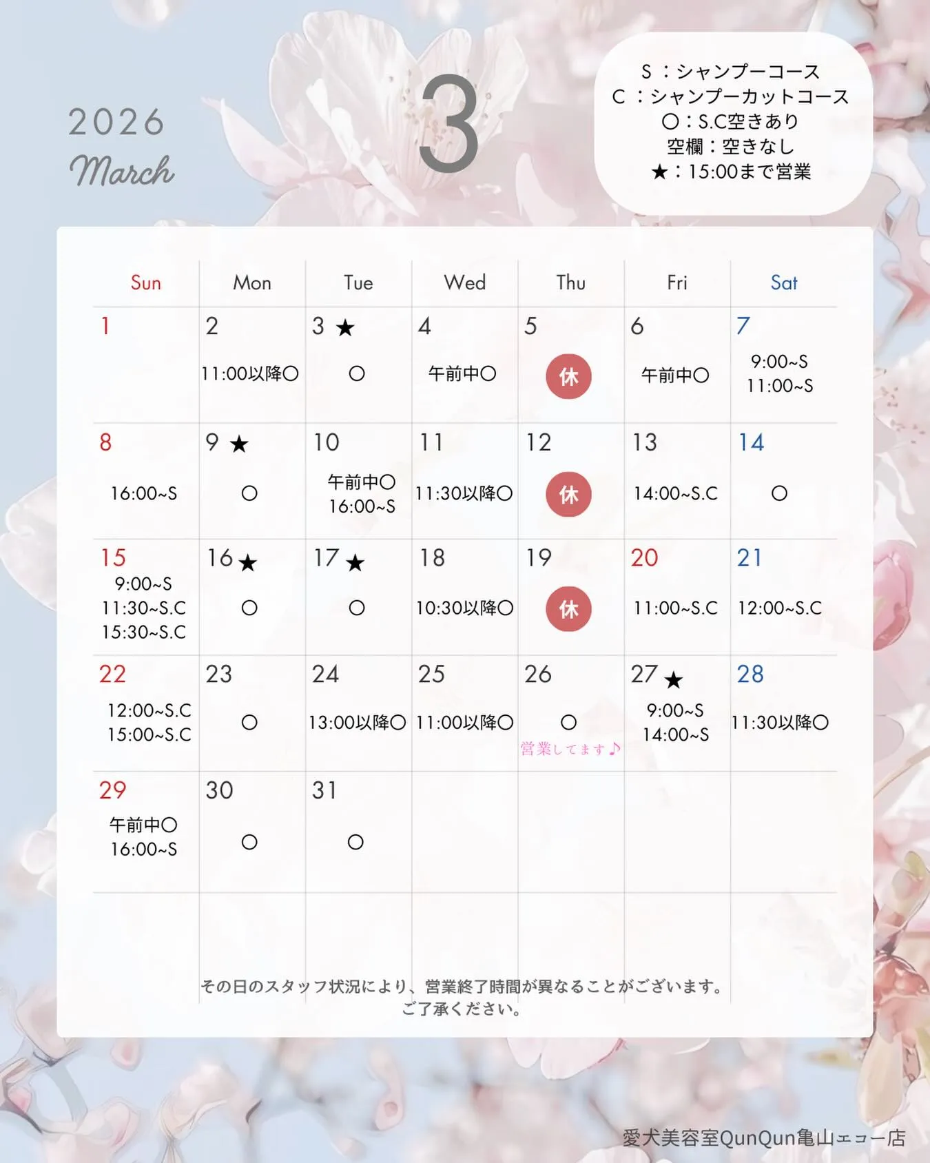 3月の空き状況です🌸(2/25 15:00時点)