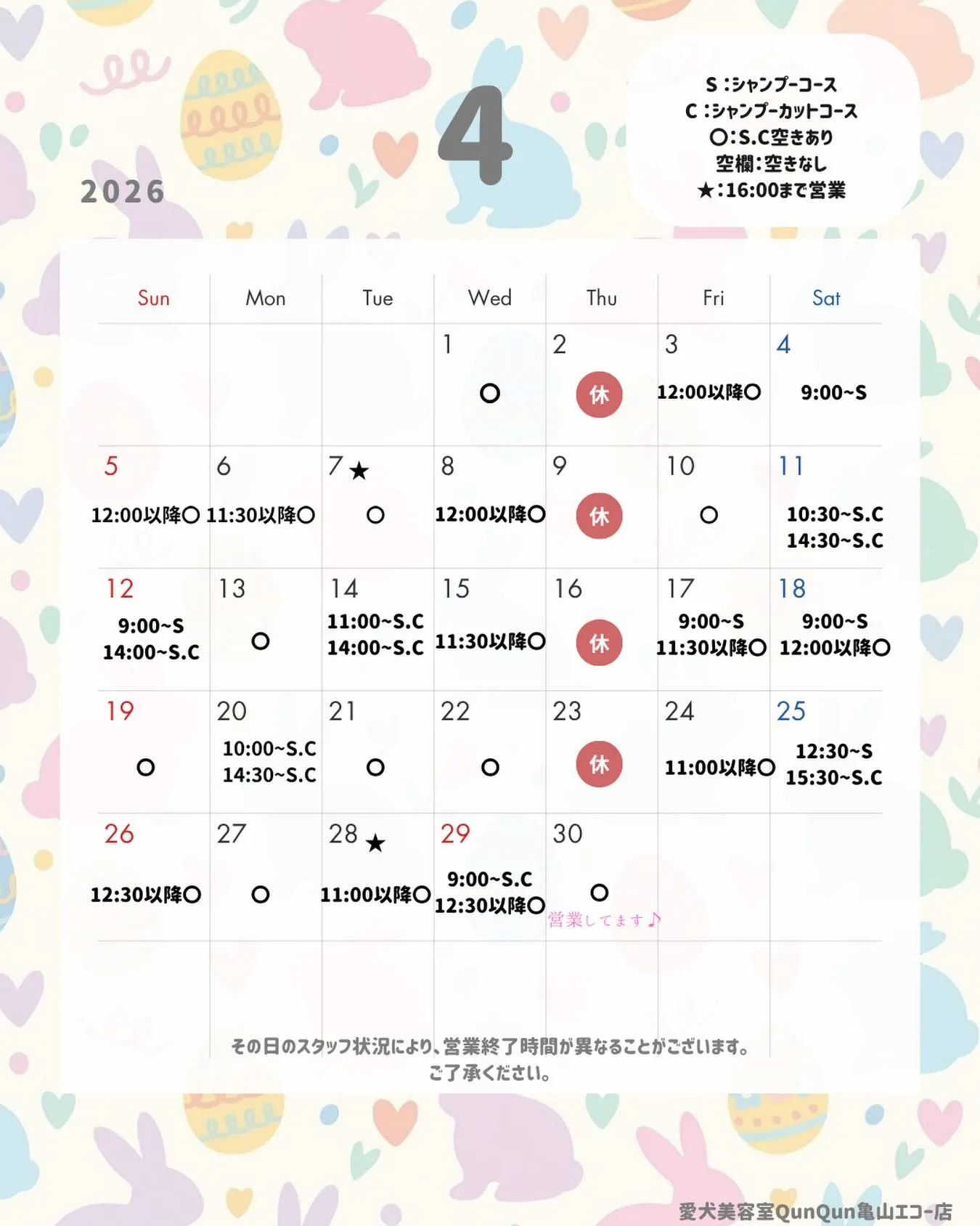 4月の空き状況です🐰(3/25 18:00時点)