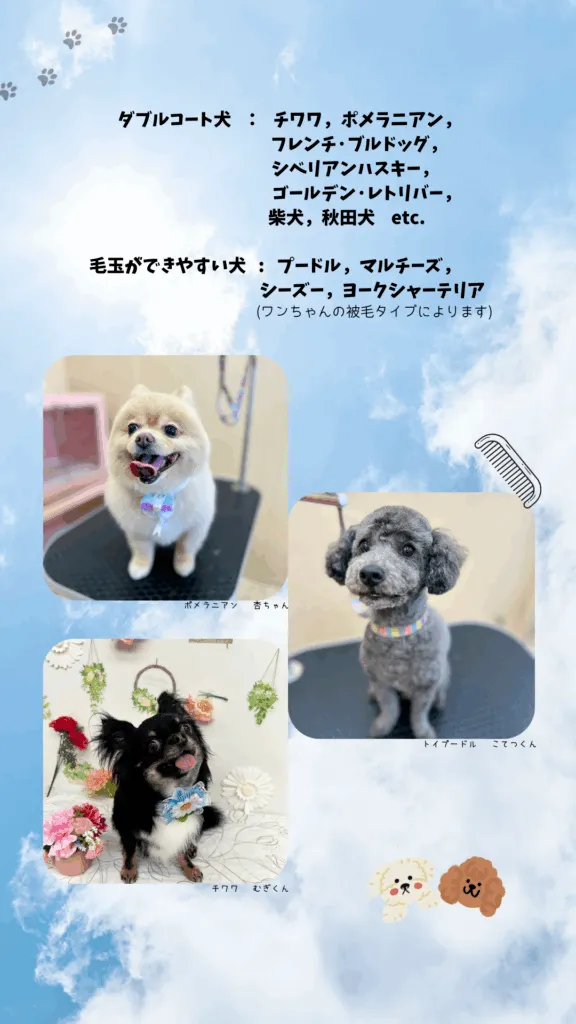 わんちゃんのブラッシングはあまり重要そうに見えませんがとっても重要なんです!! ダブルコートの犬種の場合は、“換毛期“と言って春と秋にアンダーコート(下毛)が生え変わる時期があります。 換毛期には特に抜け毛が多いので適切なブラッシングが必要です。 また毛玉ができてしまうと皮膚が引っ張られて血行が悪くなってしまい、皮膚炎を引き起こす可能性があるんです😰 例えばプードルだと抜け毛が少ない分、毛が絡まりやすく毛玉ができやすい犬種です。 1ヶ月に1回トリミングにいらしてるプードルでも毛玉ができてる子もたまに見かけます💦