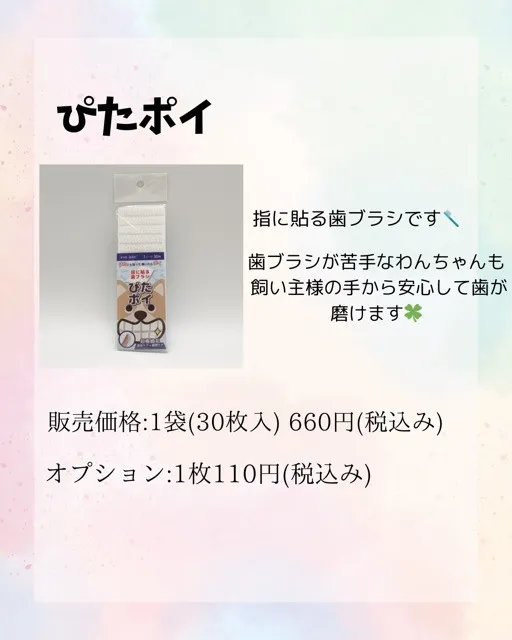 1枚使い捨てのタイプなので、いつでも清潔にワンちゃんの歯が磨けます🦷🐶 また、歯ブラシが苦手なわんちゃんも飼い主様の手から安心して歯を磨くことができます☺️