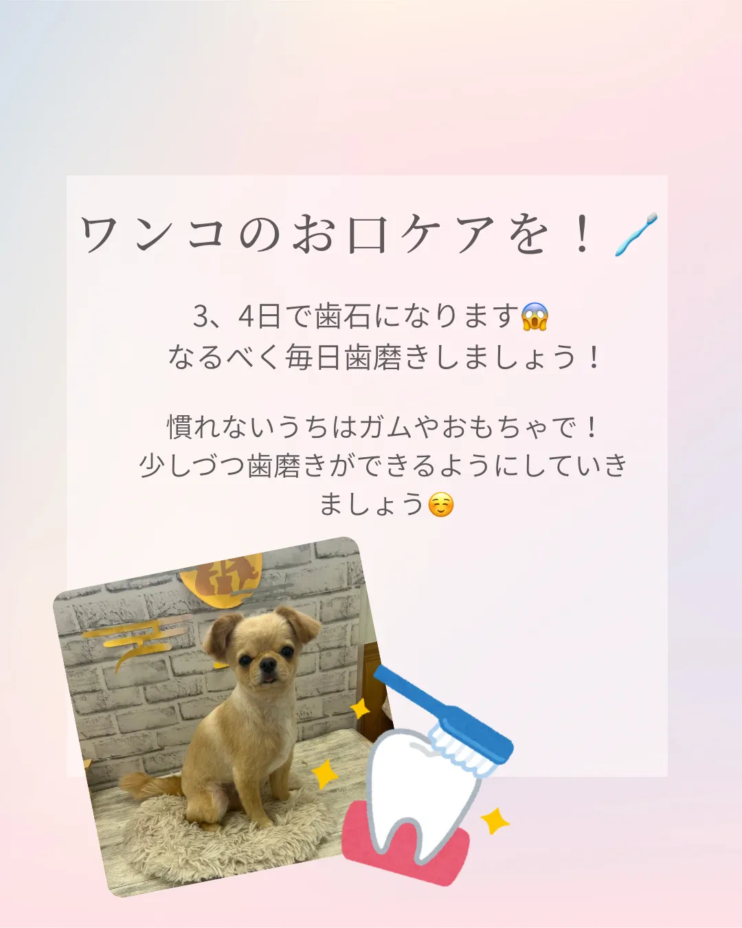 歯石とりをしないようにするためには毎日、歯磨きでケアしてあげることがとっても大切です😌