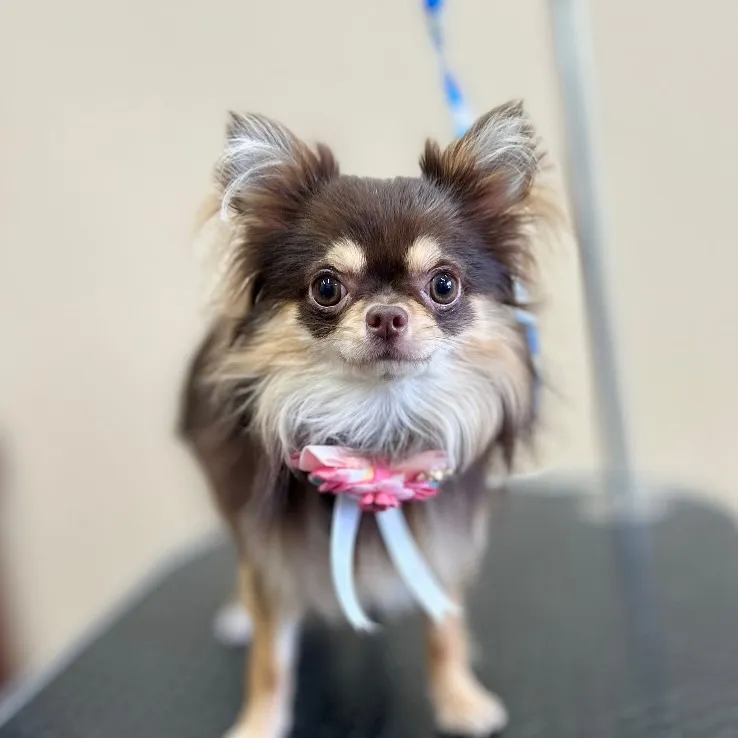 モカちゃん🍒 モカちゃん🍒初めてのトリミングに来てくれました✨ご来店ありがとうございます🎀10ヶ月で小さくてとっても可愛いチワワさんです👶🏻🧚♂️ドライヤーなど大きい音が苦手だったので弱めでゆっくりトリミングを…
